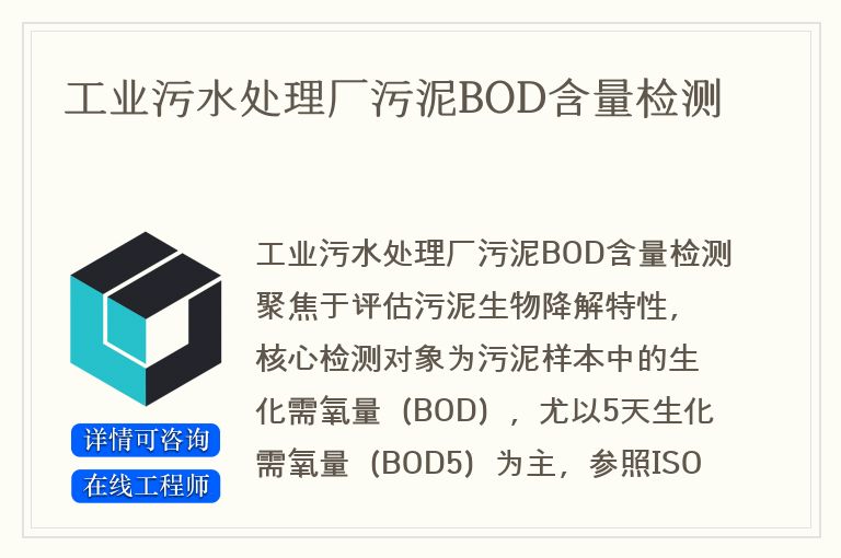 以上是关于工业污水处理厂污泥BOD含量检测相关介绍,如果您还有其他疑问,可以咨询在线工程师提交您的需求,为您提供一对一解答。