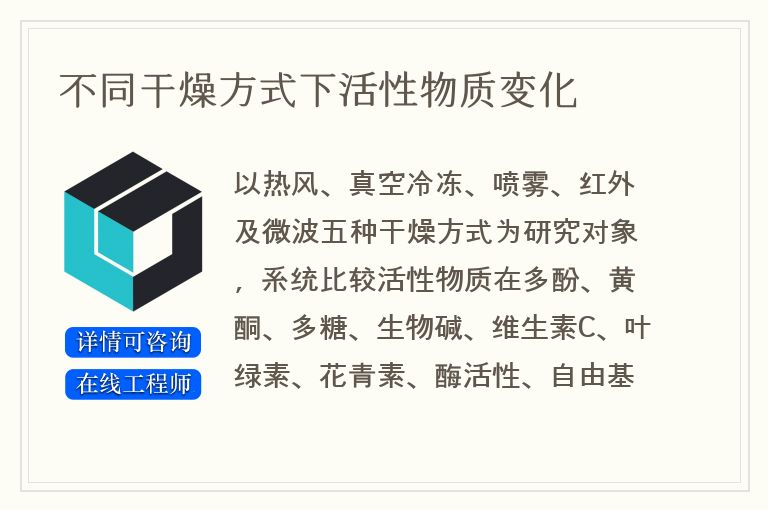 以上是关于不同干燥方式下活性物质变化相关介绍,如果您还有其他疑问,可以咨询在线工程师提交您的需求,为您提供一对一解答。